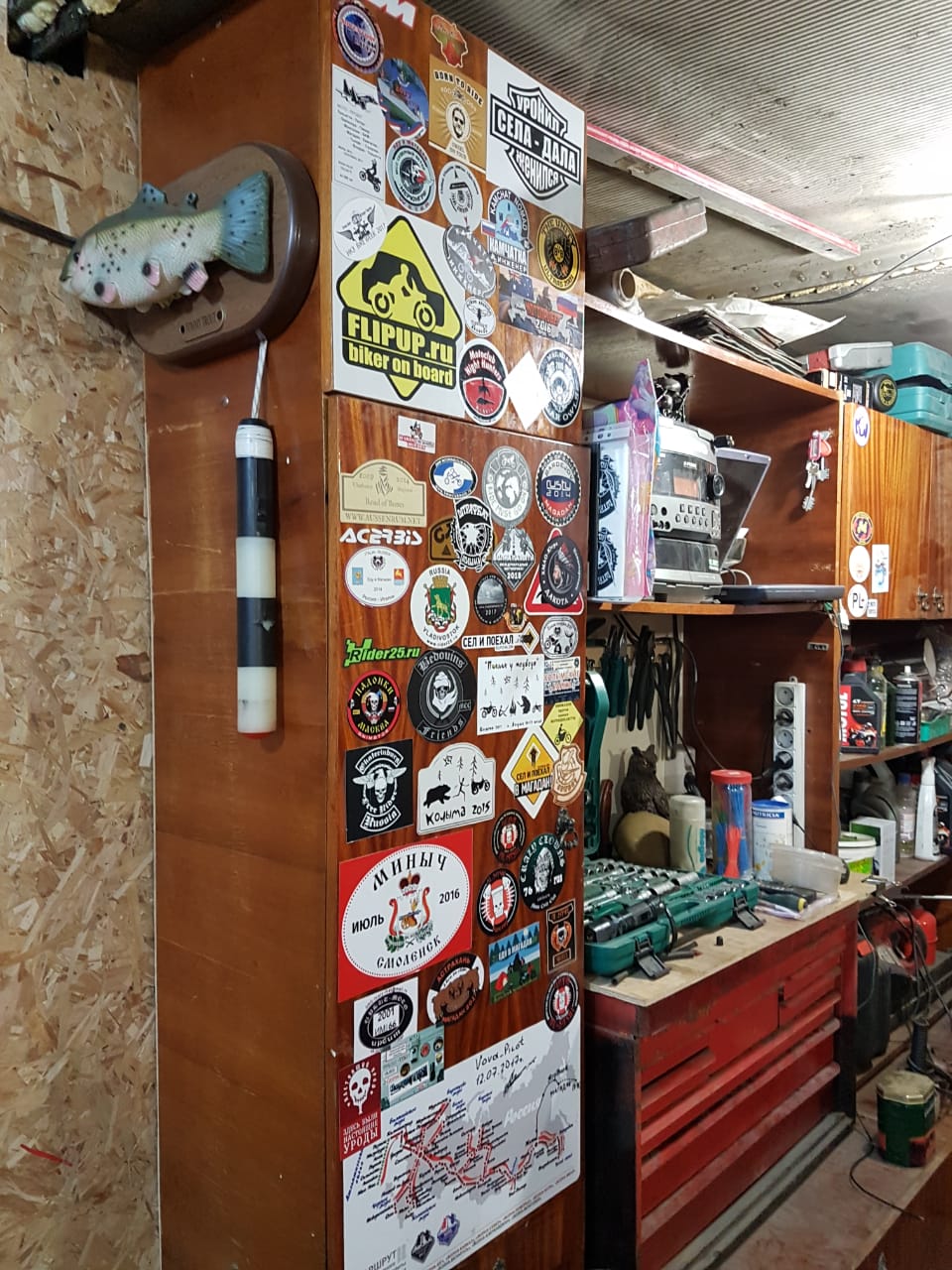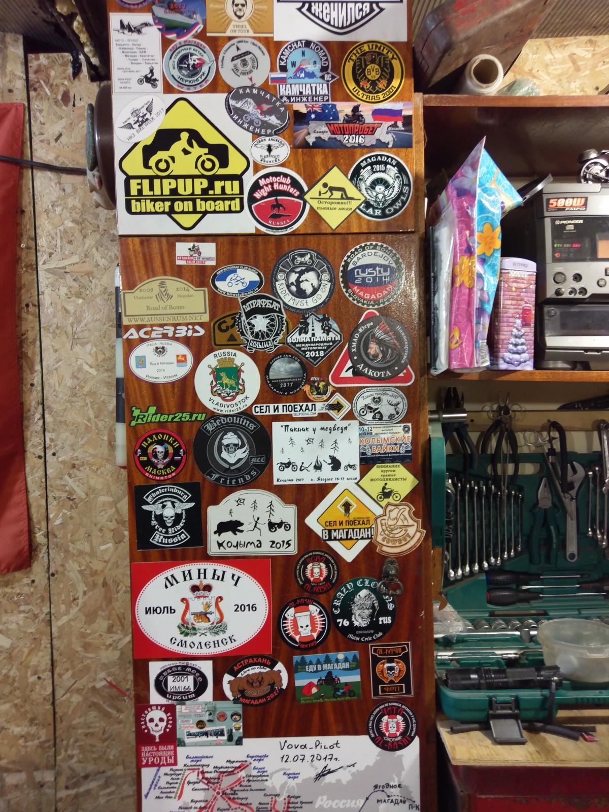 Доска наклеек у него в гараже