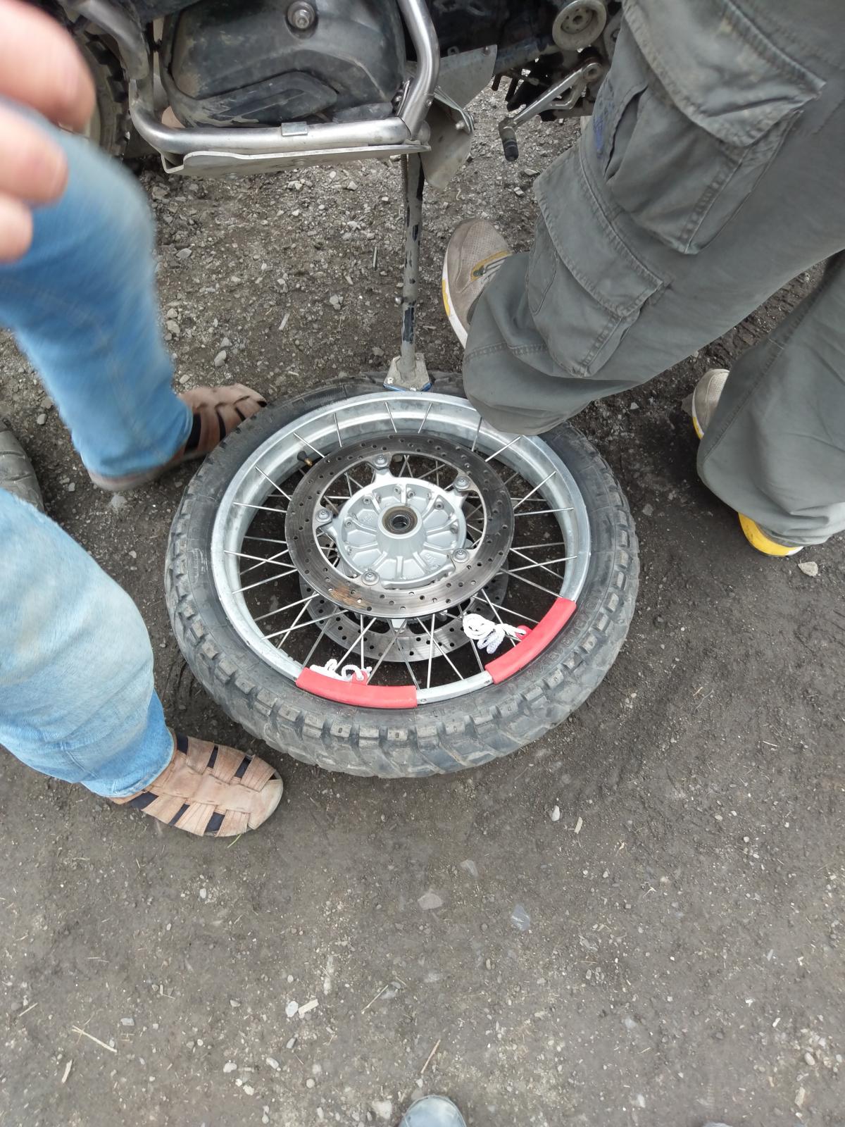 Хоть как то отблагодарить Федора Ланс подарил ему новую камеру и мы перебортировали ему колесо на его гусе 1150.
